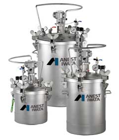 TANQUES DE PRESION DE PINTURA. Todas las partes en contacto con el fluido Acero inoxidable Presión máxima 7 bar De conformidad con la Directiva 97/23 / CEE, se entrega con el certificado de conformidad CE PET-10N / MN 10 litros de capacidad PET-30N / MN 30 litros de capacidad PET-50N / MN 50 litros Capacidad N : sin agitador neumático MN : con agitador neumático